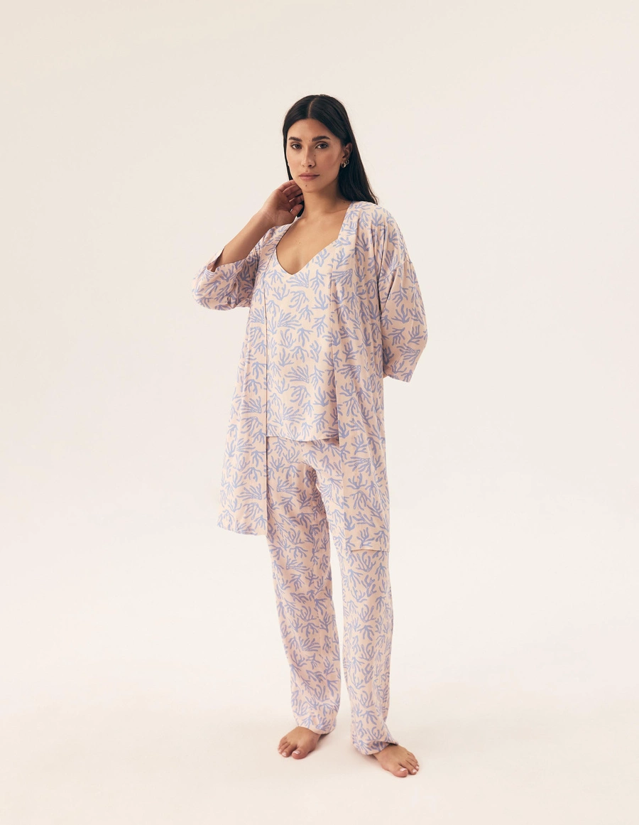 Ideal für entspannende Abende zu Hause oder als morgendlicher Luxus, vereint die Ästhetik des Mantels Eleganz und Zurückhaltung. Der helle Blauton bringt Frische ins Zuhause und der feine Stoff verleiht dem gesamten Look einen besonderen Charakter.