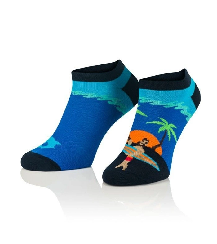 Das Modell ist im beliebten Fußsocken-Design gehalten, das besonders in wärmeren Monaten für ein angenehmes Tragegefühl sorgt. Dank des niedrigen Schafts verschwinden die Socken optisch im Schuh, was sie perfekt für Sneaker oder Freizeitschuhe macht. Der dominante Print mit dem Thema „Surf-Zeit“ sorgt für gute Laune und weckt Assoziationen an Sommer und Freiheit.