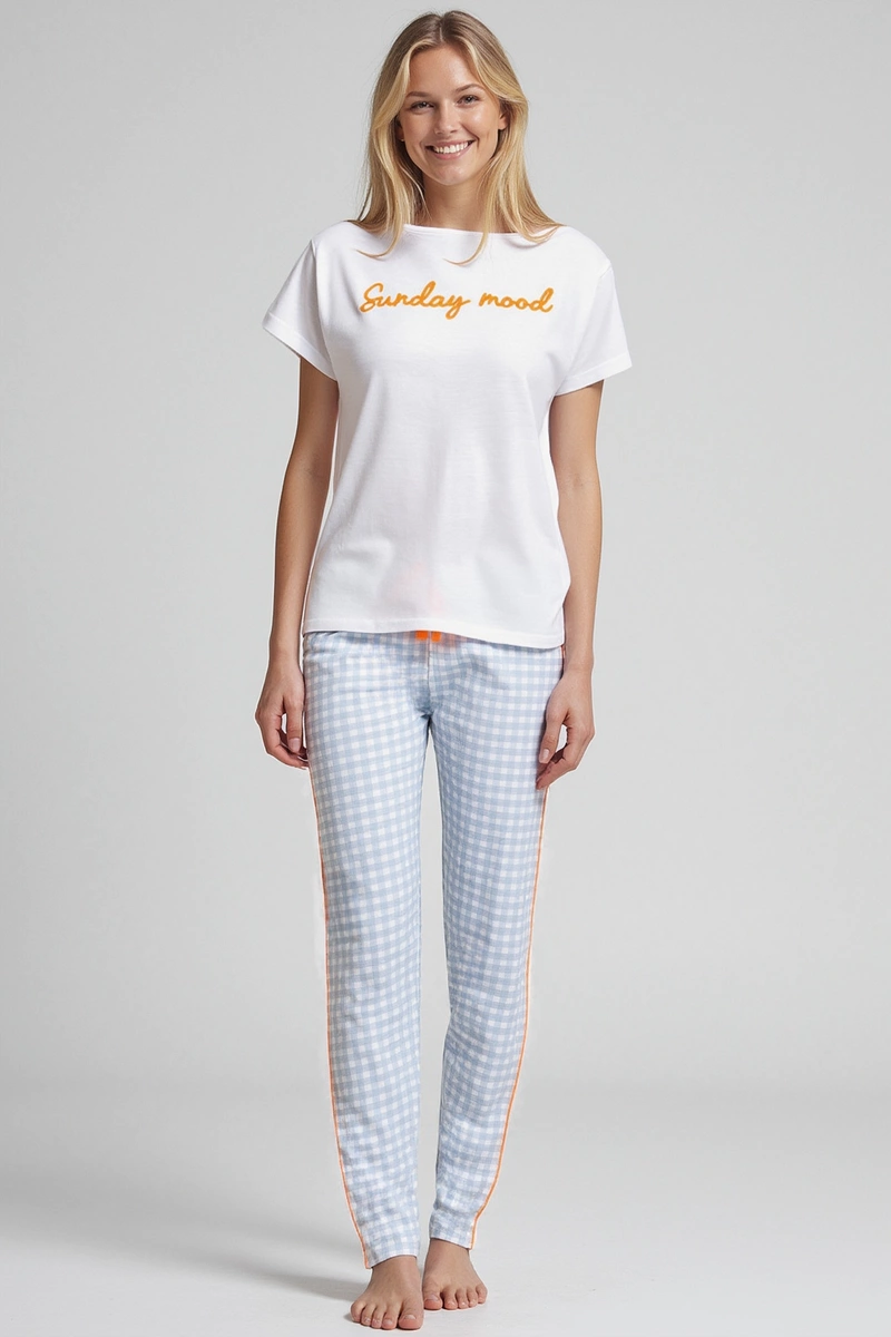 Das Oberteil des Schlafanzugs ist ein klassisches T-Shirt mit kurzen Ärmeln und einem runden Halsausschnitt. Ein dezentes, kontrastierendes Stickmotiv auf der Brust verleiht dem Oberteil eine stilvolle Note, ohne aufdringlich zu wirken. Dieses Detail unterstreicht die hochwertige Verarbeitung und die Liebe zum Detail.