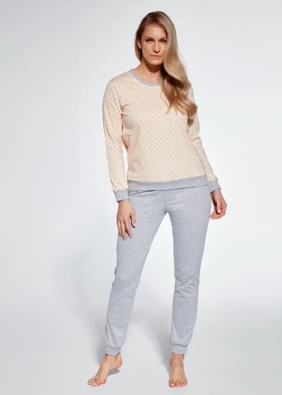 Unser Bestseller! Bequemer Damenpyjama im sportlichen Stil, der sich auch als Homewear eignet. Polka-Dot-Bluse mit langen Ärmeln mit Rippenbündchen. Graue lange Hose mit bequemem Gummibund und Rippbündchen am Bund. Lange Ärmel und lange Hosen sind ideal für Herbst- und Winternächte. Darüber hinaus ist das Pyjama-Set aus gestrick, das sich angenehm anfühlt, lässt die Haut atmen. Ein ideales Set für Frauen, die den komfort beim Schlafen.