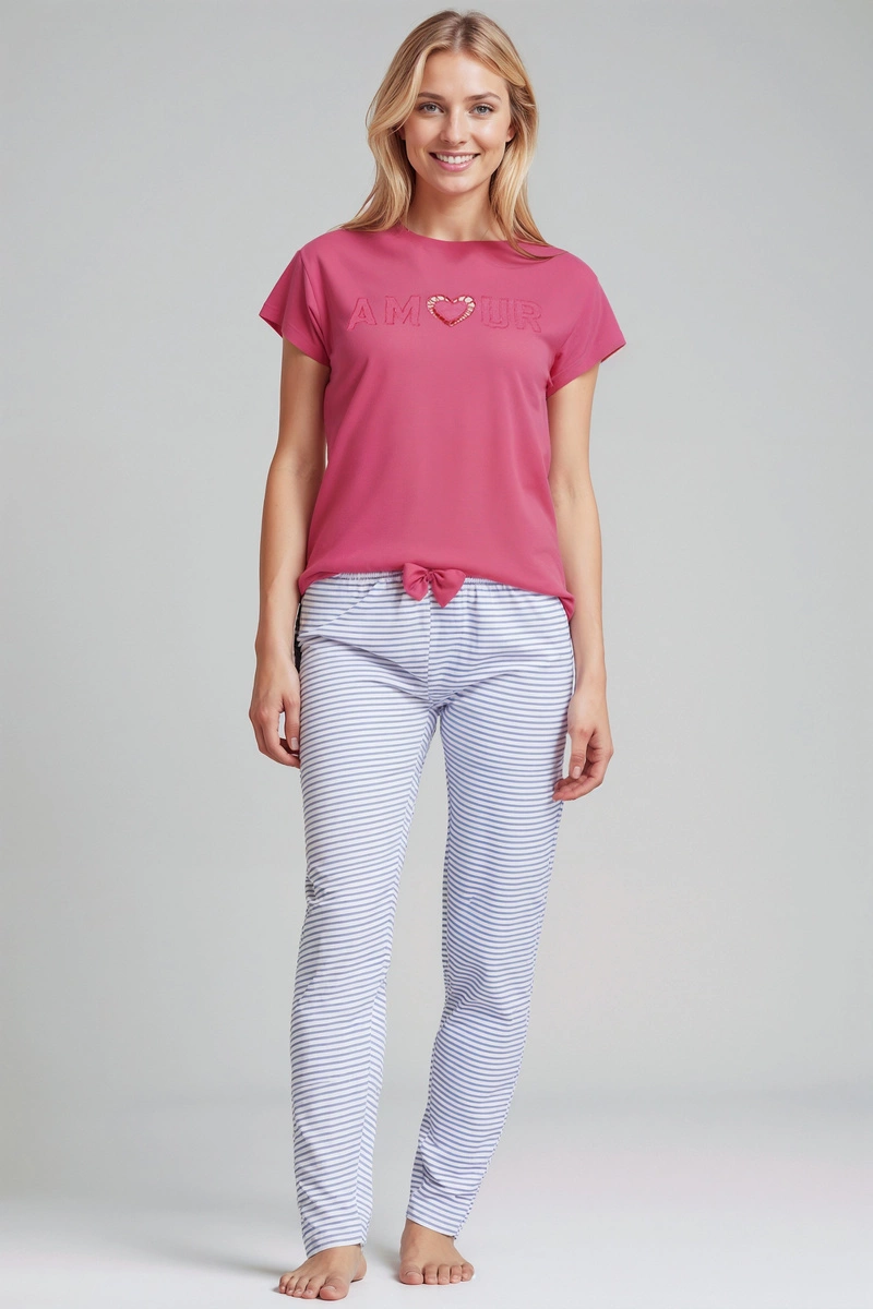 Das Oberteil des Pyjamas ist ein zartrosa Shirt mit kurzen Ärmeln, das mit filigraner Spitze und einem dezenten Schriftzug verziert ist. Dieses Design verleiht dem Schlafanzug einen femininen, modernen Charakter – ideal für Frauen, die Wert auf Details und Qualität legen.