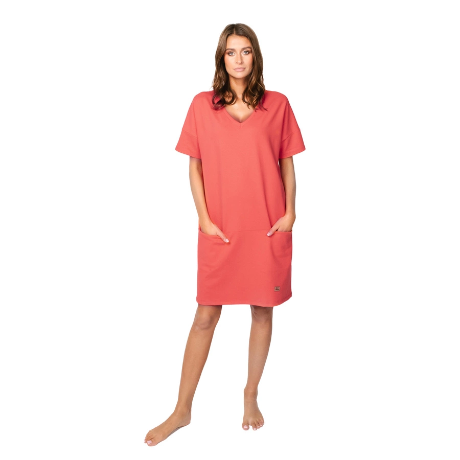 Sportlich-elegant karina Tunika mit kurzen Ärmeln ist ein Vorschlag für die Frühjahr-Sommer-Periode in vier Farbvarianten: Weiß, Denim, Camel und Koralle. Hergestellt aus einem Baumwollstrick, der eine Kombination aus hochwertiger Baumwolle mit einem Hauch von Elastan ist, wodurch er sehr dehnbar und gleichzeitig bequem im Einsatz. Sie hat praktische verdeckte taschen und Logos mit einem Öko-Lederetikett.