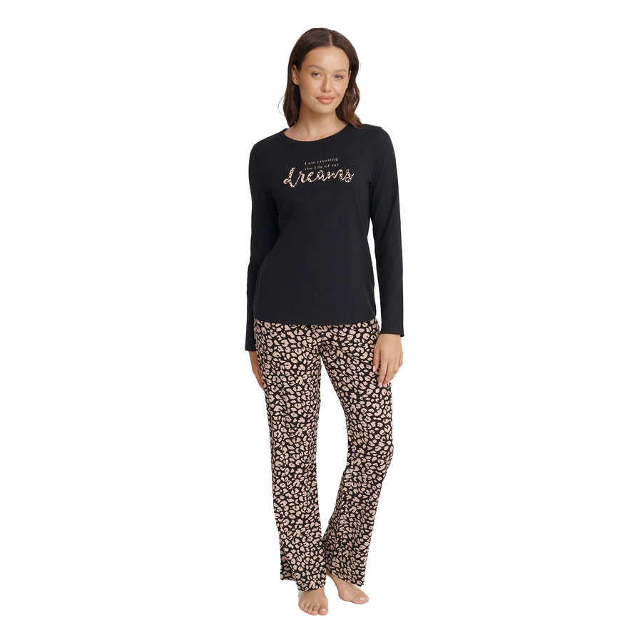- Design: Die klassische schwarze Oberteil mit dem silbernen Schriftzug "Dreams" bildet einen eleganten Kontrast zu den modischen Hosen im Leopardenmuster.