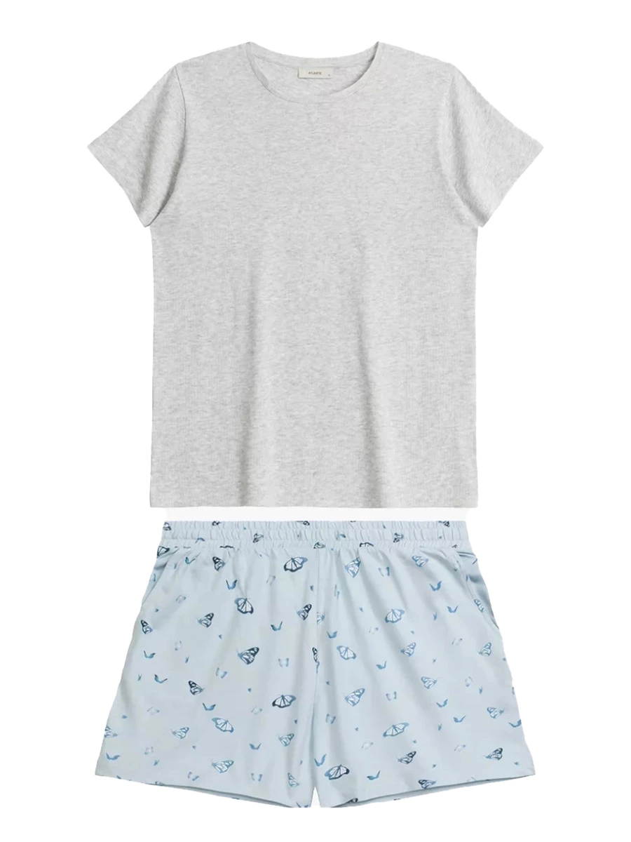 Das Oberteil der Pyjama besteht aus einem gerippten T-Shirt in hellem Grau-Melange. Mit kurzen Ärmeln und einem klassischen Rundhalsausschnitt passt es sich sanft an den Körper an und bietet ein angenehmes Tragegefühl. Die schlichte, zeitlose Gestaltung sorgt für einen stilvollen Look ohne Kompromisse beim Komfort.