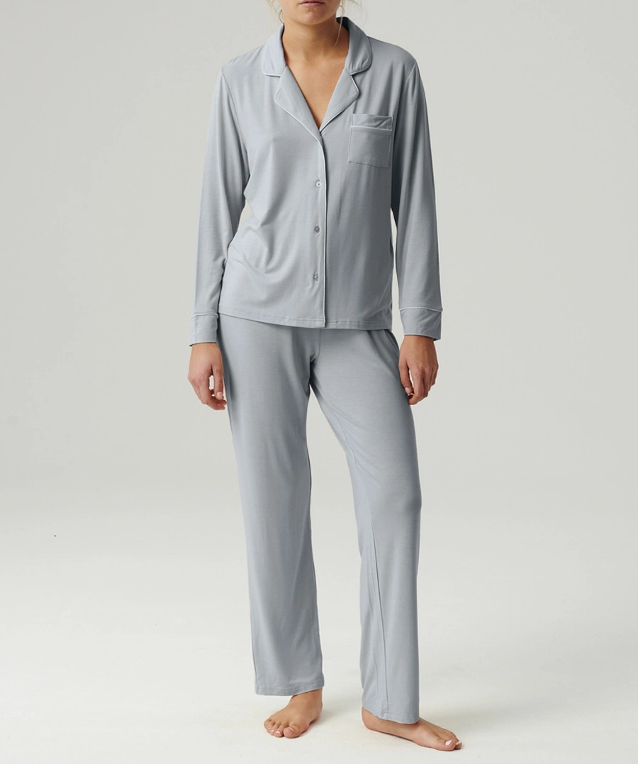 Der Pyjama besteht aus einem langärmeligen Hemd mit V-Ausschnitt und Knopfleiste sowie einer langen Hose mit geradem Bein. Er ist aus leichtem, leicht glänzendem Modal mit Elastanbeimischung gefertigt und garantiert extreme Weichheit und Atmungsaktivität. Das Material ist nicht nur angenehm auf der Haut, sondern auch körperfreundlich und damit die perfekte Wahl für warme Sommernächte.