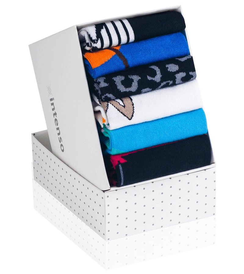 Erstellen Sie eine Schachtel mit fünf Paar Socken. Stimmen Sie Ihre Socken auf Ihren Geschmack ab. Wir arrangieren die fünf Sockenpaare Ihrer Wahl in einer gut verarbeiteten INTENSO-Box.