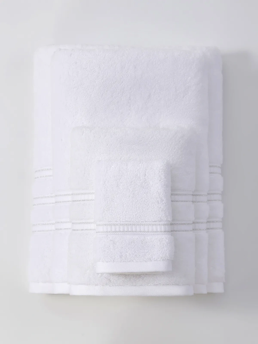 Dieses elegante Handtuch in Weiß mit einer stilvollen silbernen Bordüre bringt Klasse und Stil in Ihr Badezimmer. Es ist die perfekte Wahl für anspruchsvolle Kunden, die Premium-Qualität schätzen.