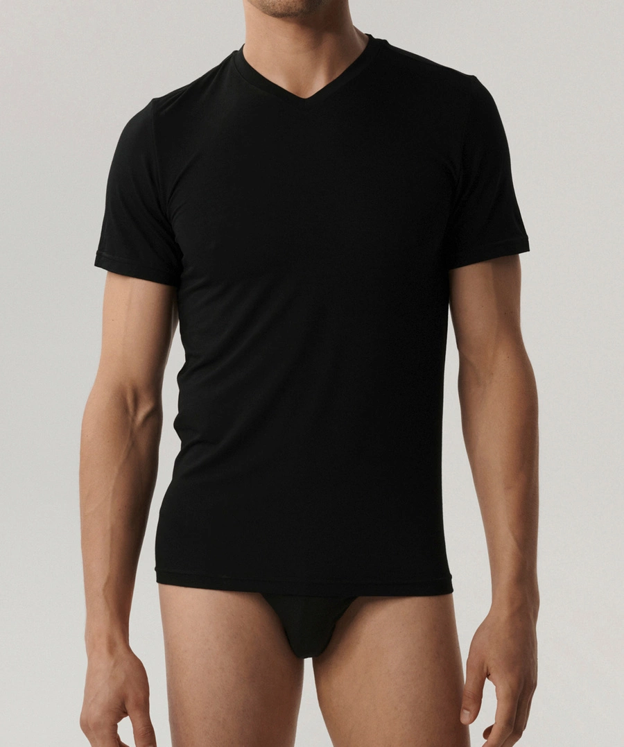 Der klassische V-Ausschnitt verleiht dem T-Shirt eine elegante Silhouette, die gleichermaßen zu Jeans, Shorts oder Stoffhosen getragen werden kann. Die schlichte Optik ohne Muster macht es zum vielseitigen Essential in jeder Herrengarderobe – ideal sowohl fürs Büro als auch für entspannte Freizeitmomente.