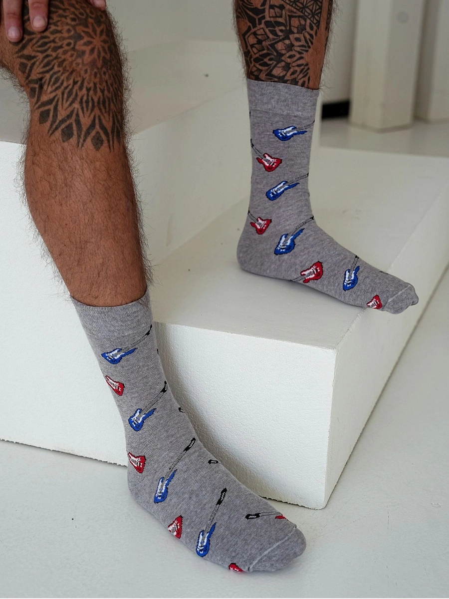 Herrensocken aus der Serie Avangard 0125 von Milena verbinden Alltagstauglichkeit mit einem modernen Design. Der renommierte Hersteller Milena steht seit Jahren für Qualität und durchdachte Details – diese grauen Socken mit einem originellen E-Gitarren-Motiv sind keine Ausnahme.
