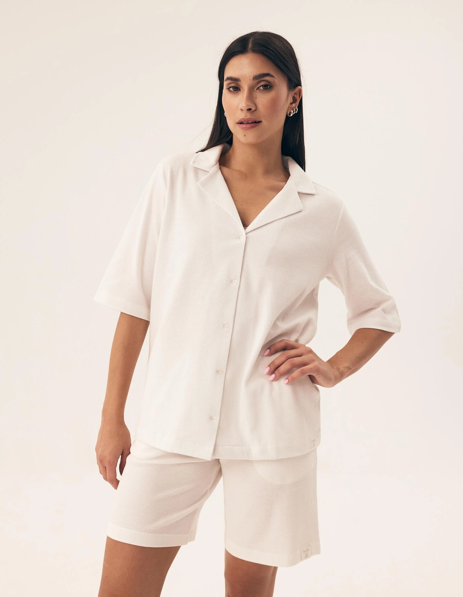 Ob für ruhige Abende zu Hause oder für gemütliche Morgen, wenn wir uns wohlfühlen und stylisch aussehen möchten, der Pyjama ist die perfekte Lösung. Das stilvolle Design zeichnet sich durch einen minimalistischen Schnitt in ecru aus, der einen Hauch von Eleganz in die Alltagskleidung bringt.