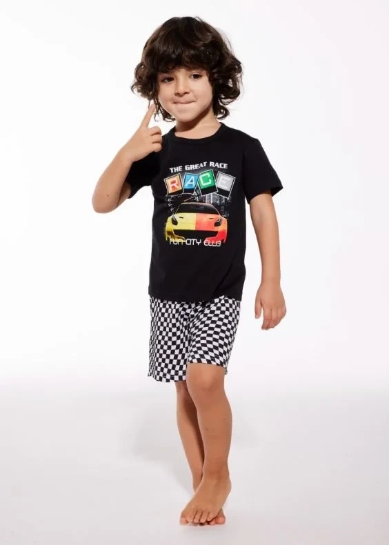 Zweiteilige Pyjamas für Jungen sind ideal für Frühling und Sommer. Pyjamas mit kurzen Ärmeln und Shorts sind sind aus hochwertiger Baumwolle gefertigt, das sich angenehm anfühlt, sanft zur Haut ist und sie frei atmen lässt. Locker sitzender Pyjama für volle Bewegungsfreiheit. Schwarzes Pyjama-Oberteil mit buntem Autodruck. Die Hose ist aus einem gestrickten Stoff gefertigt, der einer Rennflagge ähnelt. In Plastik verpackt. Polnisches Produkt. Zertifikat "Sicher für Kinder.