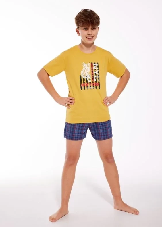 Zweiteiliger Schlafanzug für Jungen mit kurzen Ärmeln und kurzen Hosen. Honigfarbene Pyjamabluse mit einem jugendlichen Aufdruck, wodurch das Set ideal für größere Jungen ist. Die Hose ist aus aus einem gestrickten Stoff mit modischem Karo. Dieses Set ist perfekt für Frühling und Sommer. Die Pyjamas sind aus hochwertiger Baumwolle gefertigt, die die sich angenehm anfühlt und sanft zur Haut ist und lässt sie frei atmen. Locker sitzender Pyjama für volle Bewegungsfreiheit. Satz in Plastik eingewickelt.
