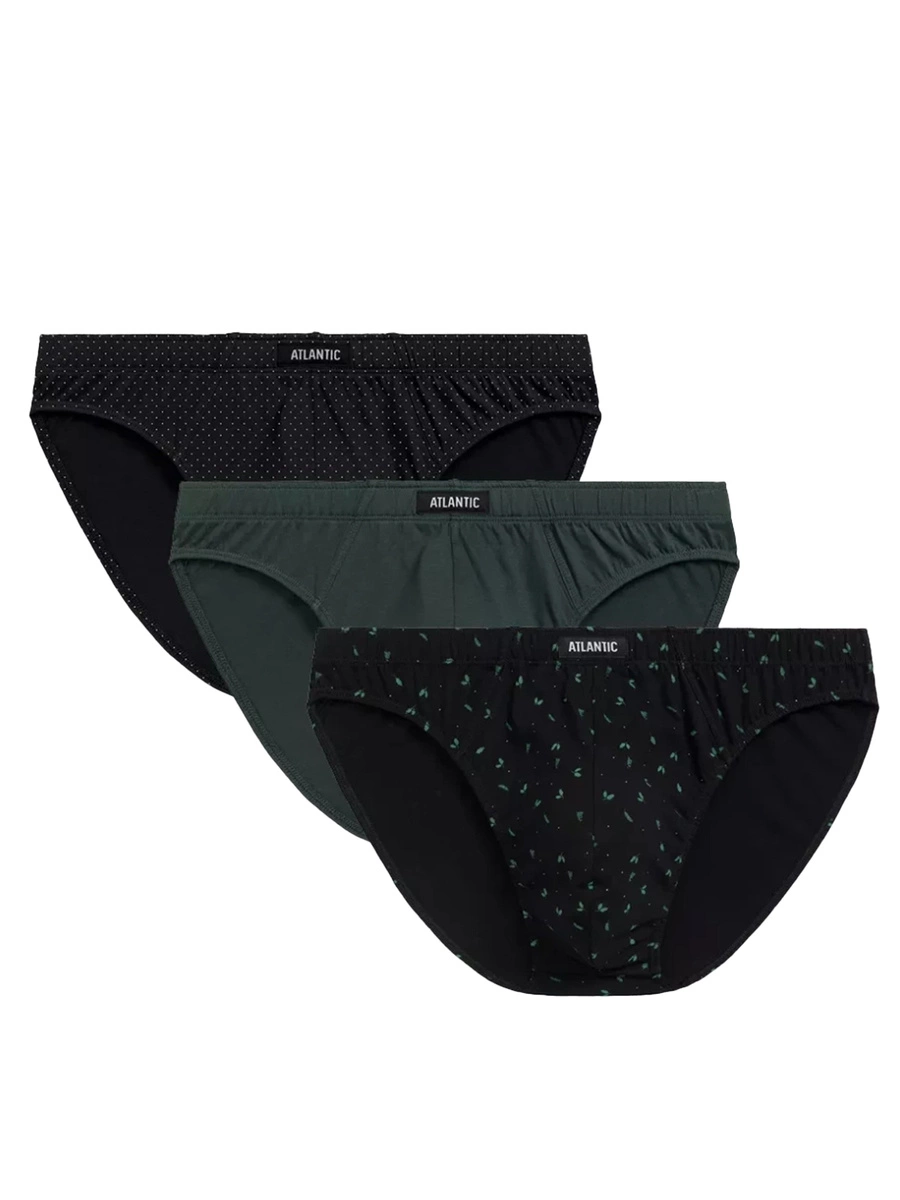 - Design: Im Set enthalten sind ein einfarbiger smaragdgrüner Slip, ein schwarzer Slip mit kleinen weißen Punkten und ein schwarzer Slip mit grünen Blättern.