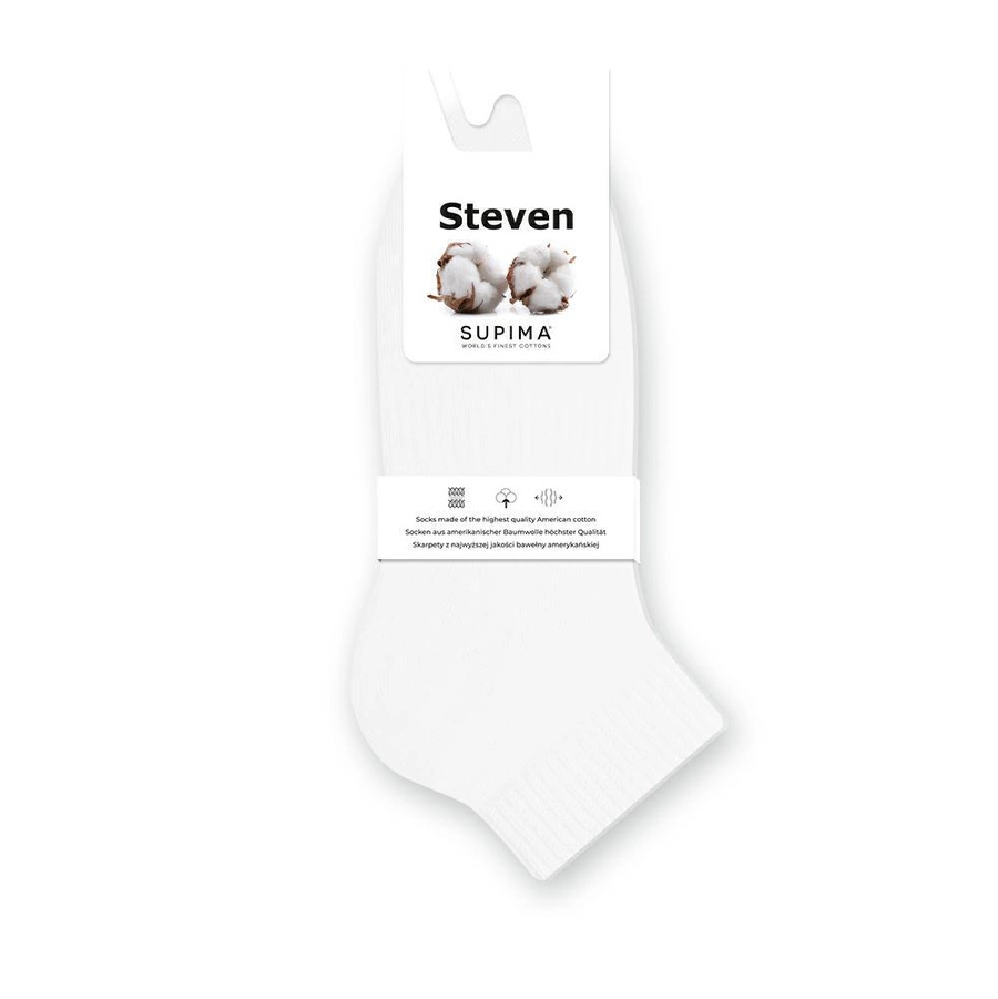 Steven, eine Marke mit langjähriger Erfahrung in der Herstellung von hochwertiger Herrenunterwäsche und -socken, präsentiert die Serie Halb-Frottee Sneaker Socken SUPIMA Art. 157 in klassischem Weiß. Dieses Modell kombiniert modernes Design mit funktionalen Eigenschaften, die Komfort und Langlebigkeit im Alltag garantieren.