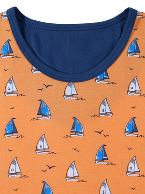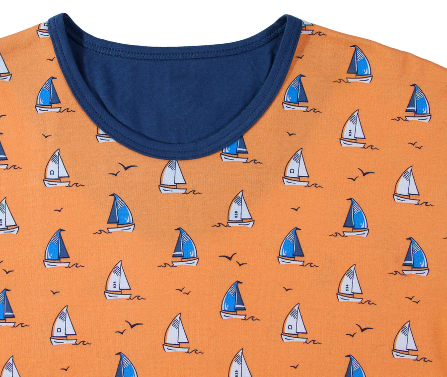 - Składa się z koszulki - T-shirt w kolorze granatowym oraz spodenek w kolorze granatowym w żaglówki idealnie dobranych do kolorystyki koszulki.