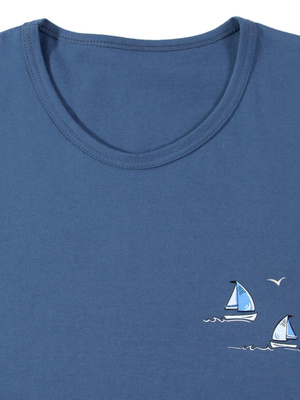 - Składa się z koszulki - T-shirt w kolorze granatowym oraz spodenek w kolorze granatowym w żaglówki idealnie dobranych do kolorystyki koszulki.