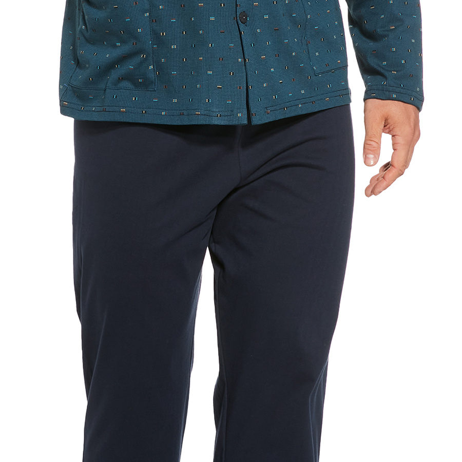 Wygodna, rozpinana piżama męska. Góra została wzbogacona o elegancki kołnierz. Uzupełnienie kompletu stanowią luźne, gładkie spodnie. Piżama została wykonana z wysokiej jakości bawełny, miękkiej i przyjemnej w dotyku. Naturalny materiał oraz sprawdzony krój sprawia, że piżama jest niezwykle wygodna, zapewnia pełen komfort ruchów podczas snu. Została zapakowana w estetyczne pudełeczko.