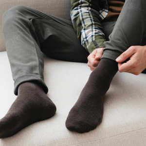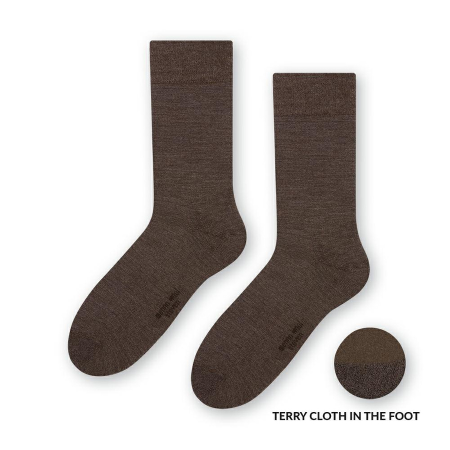 Skarpety półfrotte dla mężczyzn z wełny merynosów to produkt idealny na sezon jesienno-zimowy. Utrzymują nieprzyjemne dla bakterii środowisko. Dobrze odprowadzają wilgoć. Klasyczny model pasuje do codziennych stylizacji, a komfort noszenia zapewnia bezszwowe łączenie oraz ciepła frotta pod stopą. Dostępne w różnych wariantach kolorystycznych.