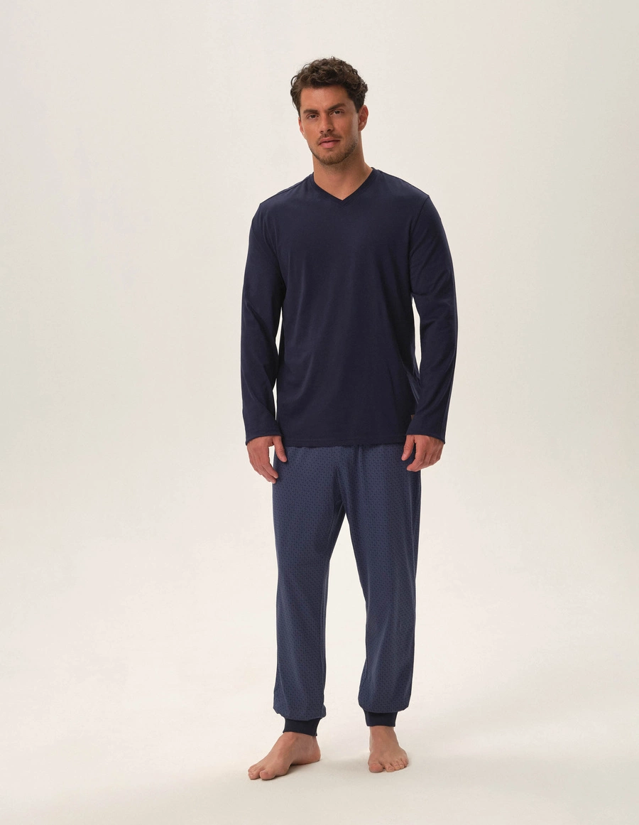 Hunt is a men's pajama with long legs and sleeves, ideal for cooler nights. You are sure to appreciate its natural, pleasant to the touch, breathable material - cotton knit. The pajamas contain no artificial admixtures, yet they are stretchy and fit the figure well. This is a model in a versatile navy blue color, with black details.