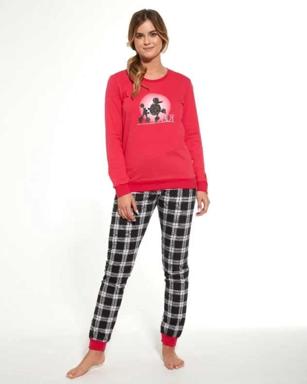 Komfortowa piżama damska w sportowym stylu. Bluzka z długimi rękawami zakończonymi ściągaczem. Długie spodnie w kratę z wygodną gumą w pasie.