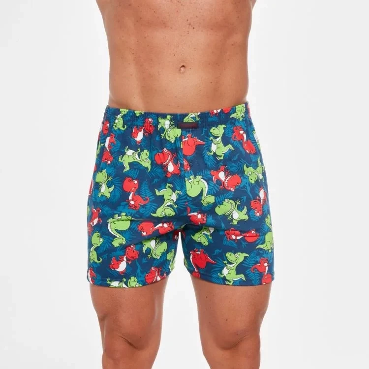 Luźne bokserki męskie ze ekstrawaganckim wzorem zostały wykonane z wysokogatunkowej miękkiej i przyjemnej w dotyku bawełny. Pełną swobodę ruchów zapewnia luźny krój oraz zastosowany materiał. Naturalna dzianina jest niezwykle delikatna dla skórymiła w dotyku, pozwala skórze swobodnie oddychać. Wygodna szeroka guma w pasie jest obszyta miękkim materiałem. Luźne bokserki są idealną propozycją dla mężczyzn ceniących sobie komfortową bieliznę i niebanalne wzornictwo.