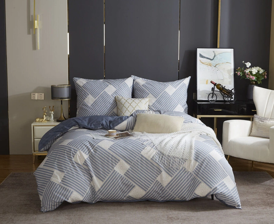Designul modern cu model geometric pe o bază albastră adaugă o notă de stil contemporan oricărui dormitor. Acest stil discret, dar elegant, se potrivește ușor în diverse tipuri de amenajare interioară, fie că este vorba de un decor minimalist sau unul mai bogat în detalii vizuale.