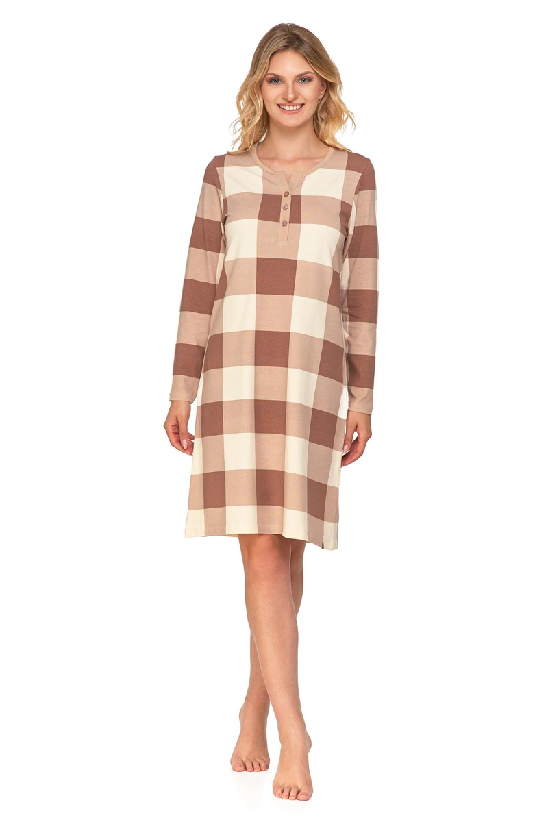 Modelul prezintă un model clasic în carouri în nuanțe bej și maro, ce se integrează natural în tendințele sezonului toamnă-iarnă. Acest design atemporal adaugă o notă elegantă și subtilă garderobei de noapte. Decolteul rotund prevăzut cu trei nasturi nu doar oferă o posibilitate de ajustare individuală, ci contribuie și la o estetică echilibrată.