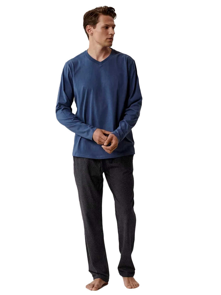 Componența setului include o bluză de culoare albastru închis și pantaloni bleumarin cu imprimeu grafic subtil. Bluza are un croi lejer, cu decolteu în formă de V și mâneci lungi fără manșete, oferind libertate de mișcare și confort termic în serile mai reci. Este ideală pentru relaxare acasă în lunile reci ale anului.