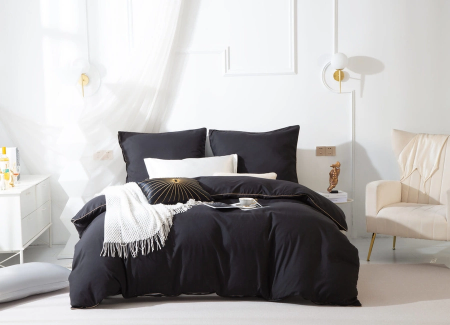 Realizată cu atenție la detalii, lenjeria oferă confortul necesar pentru un somn liniștit și relaxant. Culorile contrastante – negrul profund și auriul subtil – creează o atmosferă modernă, dar și intimă. Acest contrast adaugă un farmec aparte spațiului de odihnă, transformând patul într-un element central al decorului interior.