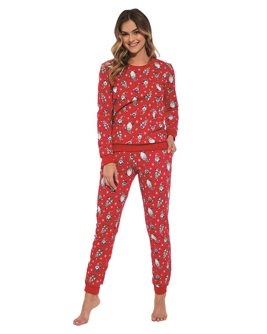 Niezwykle wygodna piżama damska z motywem świątecznym z długim rękawem i długimi spodniami, tworzy idealne zestawienie na jesień i zimę. Czerwony kolor piżamy ozdobiony świątecznymi mikołajami. Spodnie i góra piżamy zakończone ściągaczami, piżama posiada również kieszenie. Komplet piżamowy jest bardzo miły w dotyku. Piżama damska wykonana z naturalnej dzianiny, która pozwala skórze oddychać. Piżama idealna na świąteczny prezent.