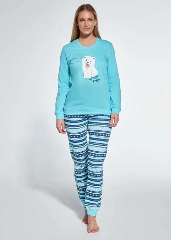 Górna część piżamy ma modny kolor, który harmonijnie łączy się z tematycznym wzorem spodni, co sprawia, że całość jest nie tylko funkcjonalna, ale i estetyczna. Zarówno spodnie, jak i góra piżamy są zakończone ściągaczami, które dodają wygodę i przyjemność noszenia.