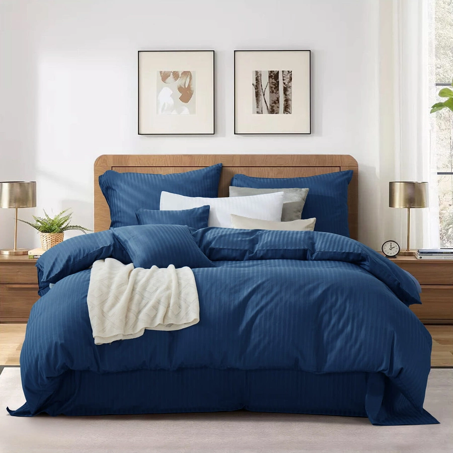 Setul este format din husă pentru pilotă și una sau două fețe de pernă, în funcție de dimensiunea aleasă. Fabricată integral din bumbac cu țesătură din damasc (satinată), lenjeria oferă un echilibru excelent între finețe și rezistență. Țesătura de damasc cu dungi de 1 cm adaugă un efect vizual subtil și sofisticat, care transformă orice dormitor într-un spațiu elegant.