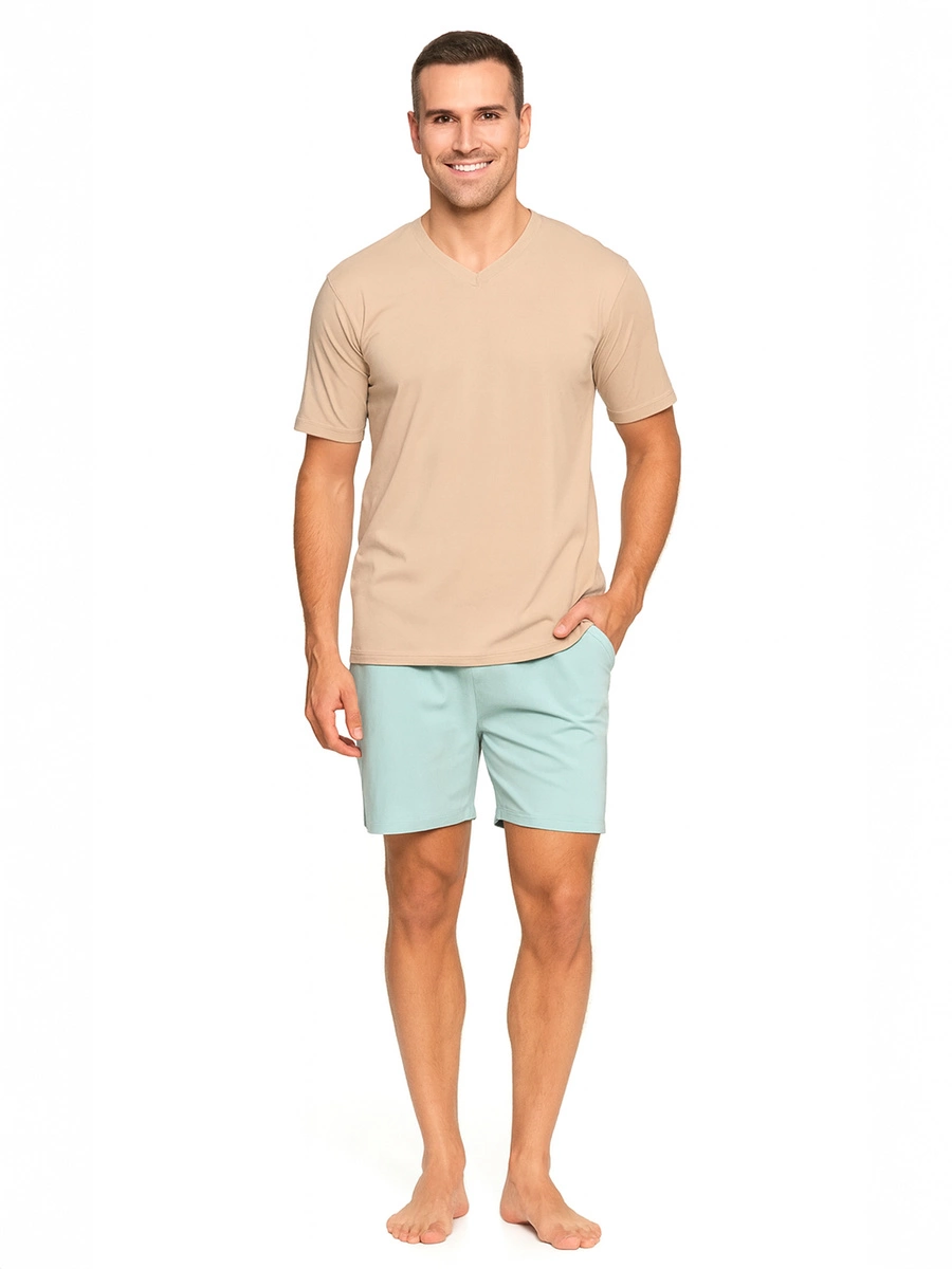 Pijamaua este prezentată într-o nuanță bej, discretă și versatilă, potrivită pentru bărbații care preferă culorile neutre. Lipsa unui model decorativ dominant contribuie la un design sobru și elegant, care nu se demodează în timp.