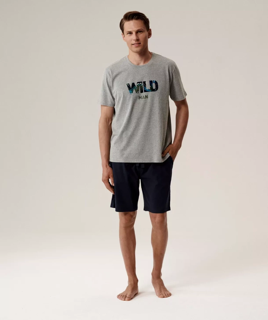Tricoul cu mâneci scurte și decolteu rotund este realizat dintr-un amestec de 80% bumbac și 20% vascoză, oferind o senzație plăcută la atingere și o bună circulație a aerului. Designul este completat de un imprimeu cu textul „WILD”, adăugând o notă expresivă și contemporană, potrivită pentru bărbații care apreciază atât confortul, cât și un element de personalitate în garderoba de casă.