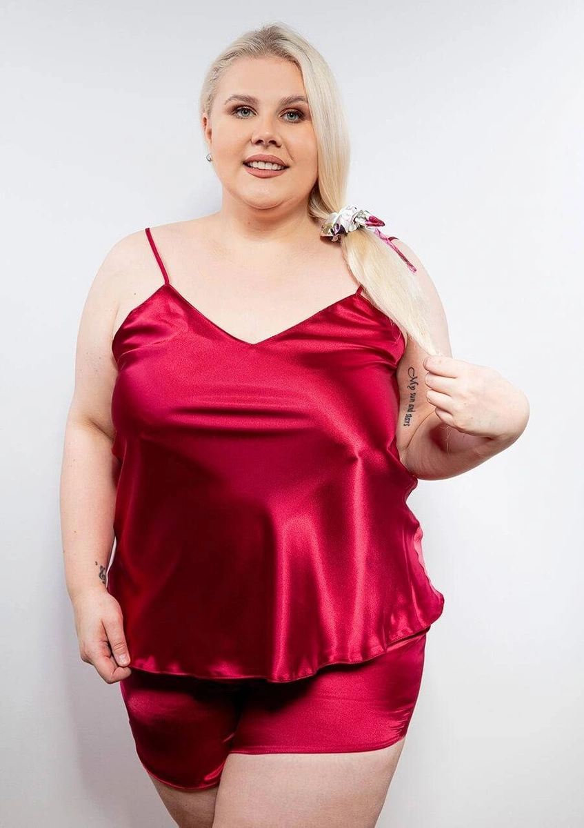 - Krój: Komplet składa się z krótkich szortów i topu z głębokim dekoltem, które razem tworzą zalotny i zmysłowy zestaw.