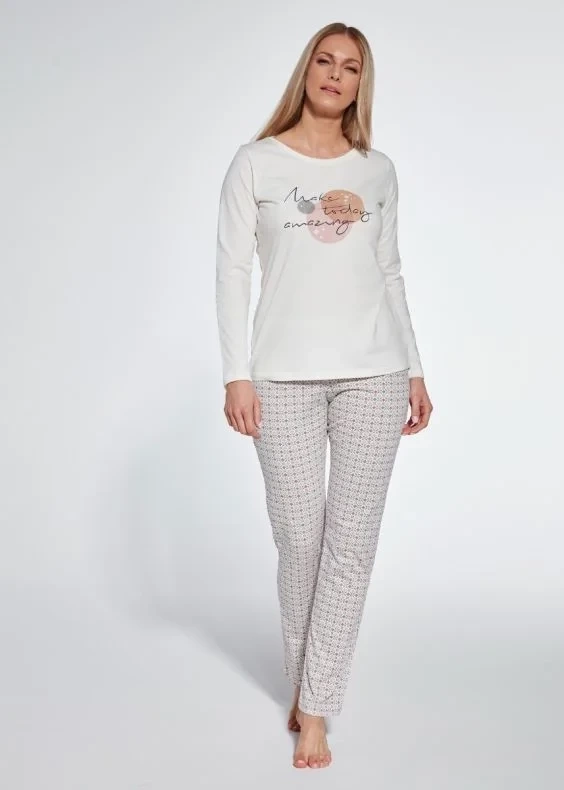Elegancka piżama damska jest idealnym wyborem na chłodne jesienne i zimowe noce. Zestaw składa się z bluzki z długimi rękawami oraz długich spodni, co zapewnia dodatkowe ciepło. Bluzka prezentuje się w modnym kolorze, który podkreśla indywidualność i styl. Subtelne sitodruki dodają jej wyjątkowego charakteru.