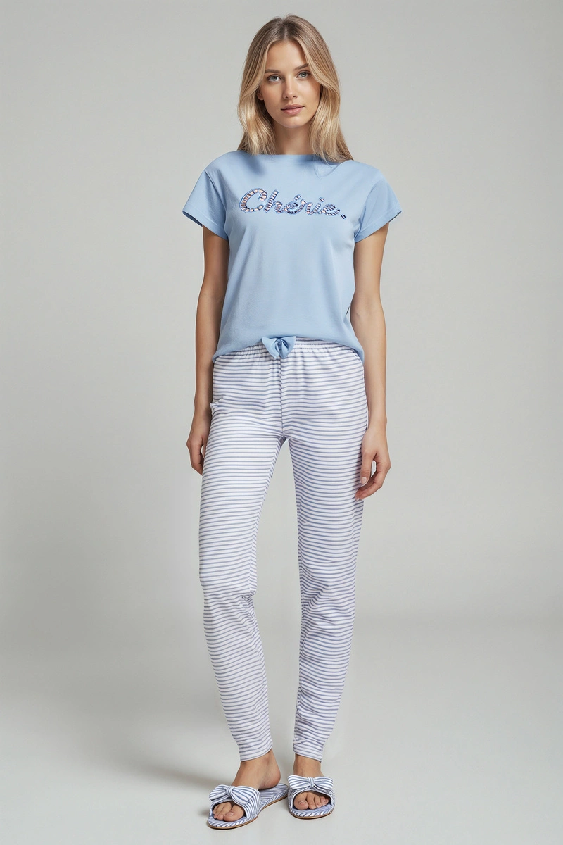 Partea de sus a pijamalei este un tricou roz cu mânecă scurtă, decorat cu broderii subtile ajurate și litere pentru a adăuga o notă modernă. Partea de jos este un pantalon lung alb cu dungi albastre, prevăzut cu o talie elastică cu legături pentru o potrivire perfectă. Acest set este o combinație de clasic și modern care cu siguranță va fi pe placul fiecărei femei.