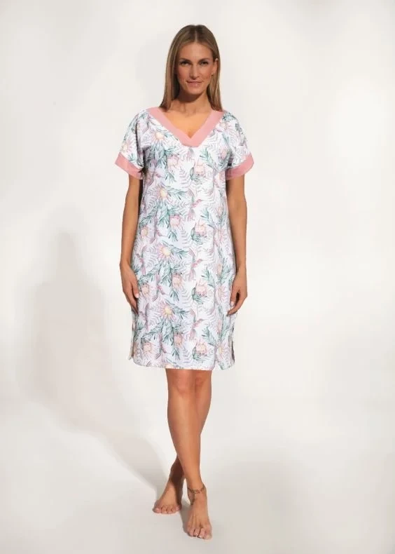Elegancka koszula nocna damska z krótkim rękawem. Koszula w "serek" utrzymana w kolorystyce pudrowego różu, ozdobiona szeroką plisą pod szyją. Ta sama plisa znajduje się w mankietach. Koszula została wykonana z miękkiej dzianiny z kwiatami i kolibrami. Luźny krój piżamy zapewnia pełen komfort podczas snu. Ten delikatny komplet wykonany z wysokogatunkowej bawełny zapewnia skórze swobodne oddychanie, a także łączy w sobie wygodę i styl.