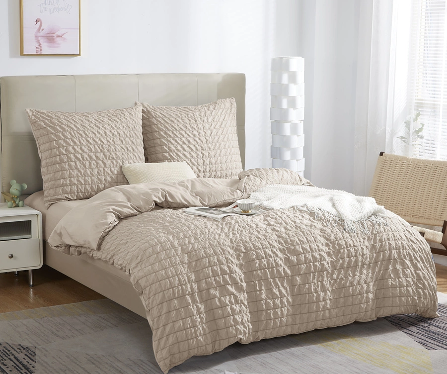Cu un model încrețit unic care amintește de scoarța de lemn, lenjeria de pat nu numai că arată elegant, dar introduce și elemente de frumusețe naturală combinate cu designul modern. Setul include o față de plapumă și două fețe de pernă în dimensiunea 70x80 cm, ideale pentru un pat dublu. Fermoarul omologat asigură confortul de utilizare și durabilitatea produsului.