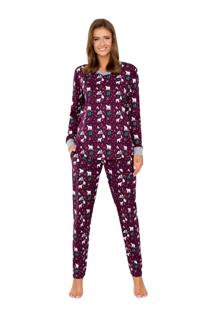 Ava to urocza damska piżama, której wzór sprawi, że świąteczny czas nabierze jeszcze większych rumieńców. Luźne, wygodne spodnie z kieszeniami i bluza wykończona kontrastowymi, szarymi ściągaczami.