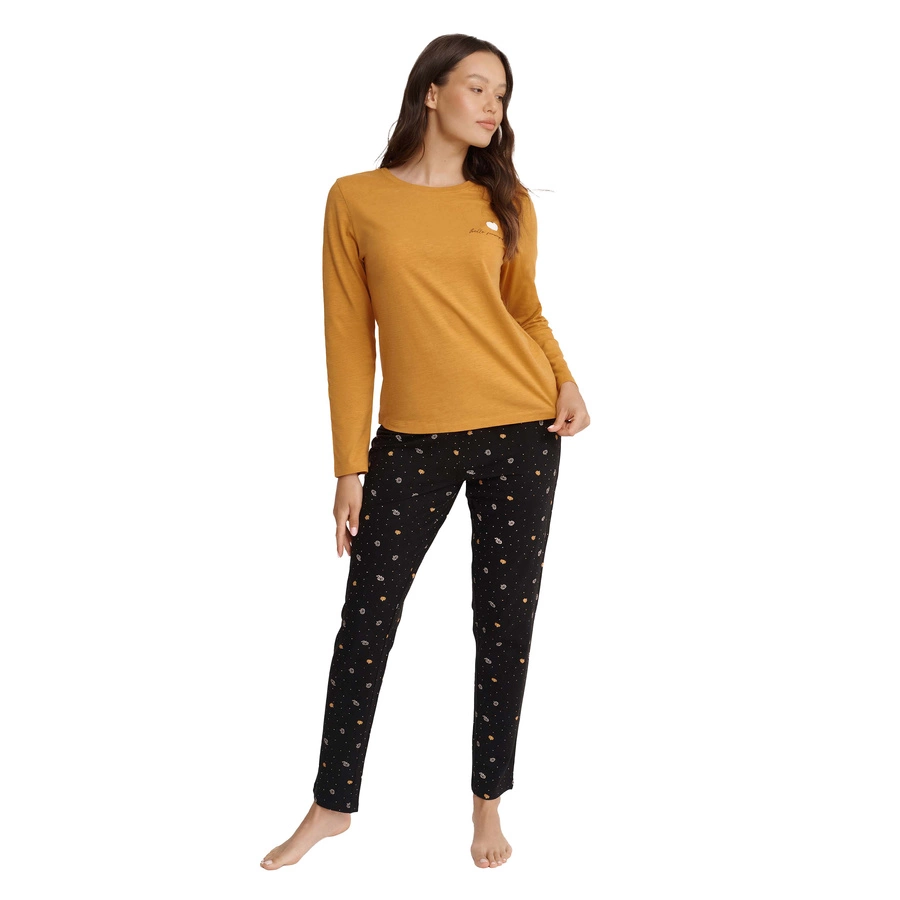 Prezentowana piżama damska marki Grind Henderson zachwyca klasycznym, ale jednocześnie nowoczesnym designem. Jej żółta bluzka z długimi rękawami wykonana została w 100% z miękkiej i przewiewnej bawełny. Okrągły dekolt doskonale układa się na szyi, dodając elegancji całości. Dyskretny napis umieszczony z boku piersi dodaje uroku i podkreśla dbałość o detale.