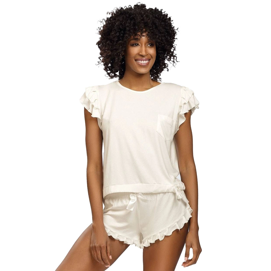 Zestaw i Detale: Komplet składa się z krótkich spodenek, które charakteryzują się uwodzicielską falbanką na dole. Uzupełnieniem jest krótka bluzeczka, która równie subtelnie zdobiona jest falbankami na rękawkach. Zarówno spodenki, jak i bluzeczka, mają ściągacz z satynową kokardą, co umożliwia idealne dopasowanie do każdej figury.